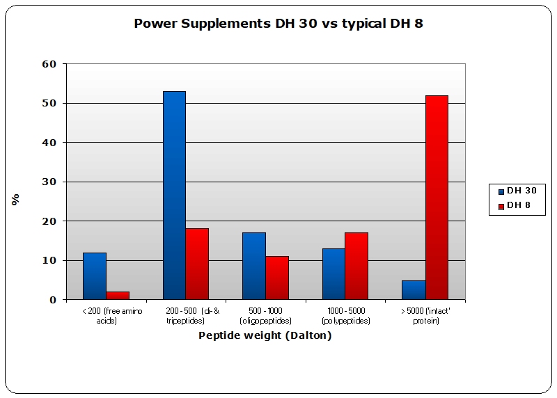 Whey Protein Hydrolysate DH30 heeft een zeer hoge hydrolysegraad (DH) en daardoor een hoog aandeel di- en tripeptiden van rond de 50%. Het aandeel vrije aminozuren is laag waardoor de opnamecapaciteit van de darmen niet wordt overschreden. Het merendeel van de overige peptidenketens zijn tussen 4 en 15 aminozuren. Na minimale vertering kunnen ook deze peptiden opgenomen worden. Minder dan 10% van de peptideketens is opgebouwd uit meer dan 15 aminozuren.